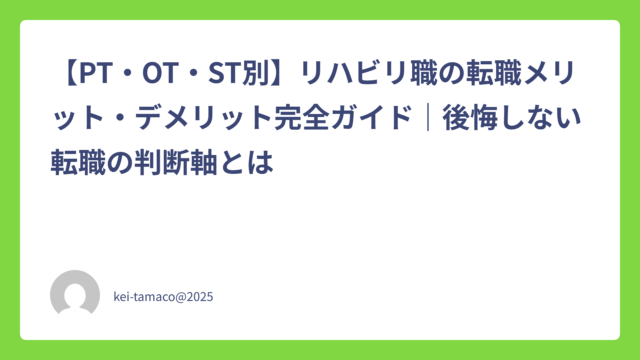 Uncategorized 【PT・OT・ST別】リハビリ職の転職メリット・デメリット完全ガイド|後悔しない転職の判断軸とは 2026年4月25日 kei-tamaco@2025 https://www.carework-switch.site/wp-content/uploads/2025/09/Pink-Pastel-Quotes-Twitter-Header.png リハビリ職のキャリア研究所
