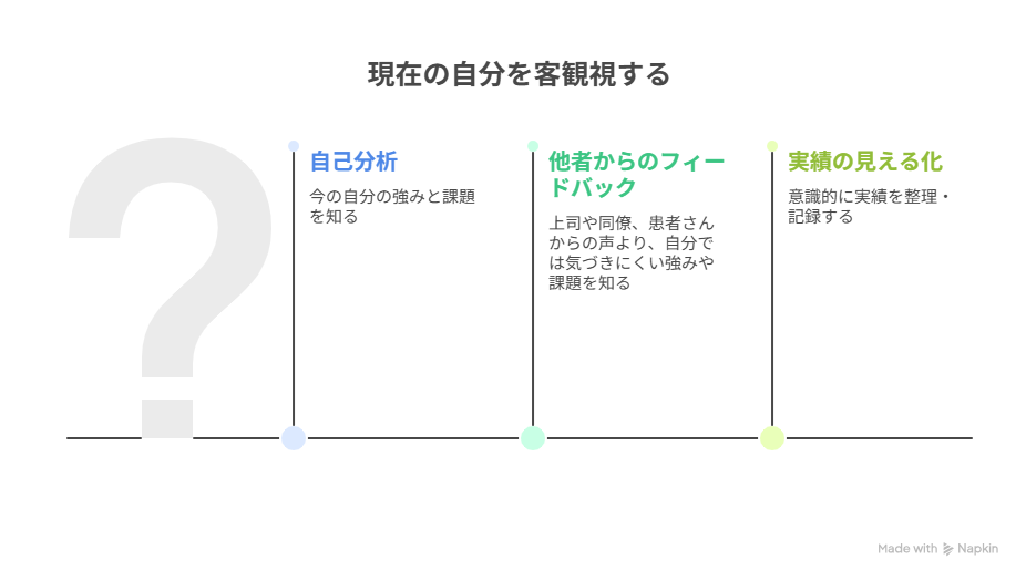 自己分析だけでは、どうしても主観的になりがちです。そこで重要なのが「他者からのフィードバック」です。上司や同僚、患者さんからの声は、自分では気づきにくい強みや課題を浮き彫りにしてくれます。