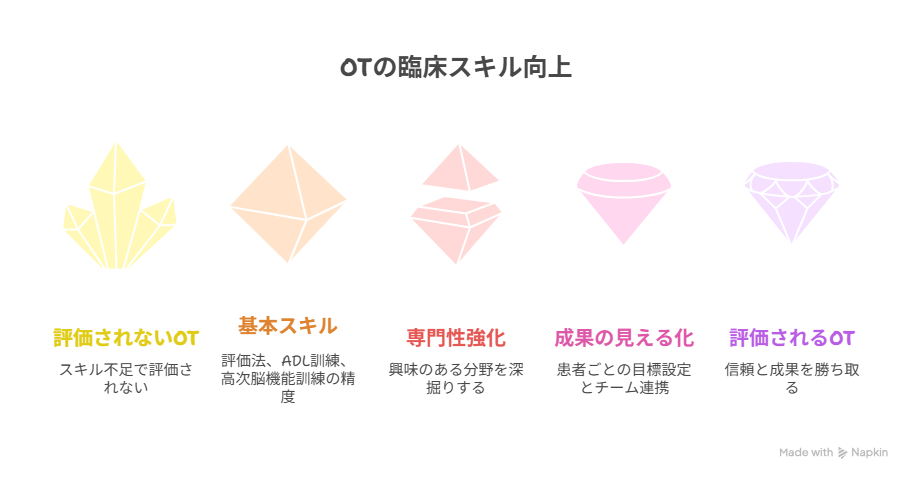 「自分なりに頑張っているのに成果が見えない」「評価されない理由が分からない」という場合、多くはスキルの不足そのものではなく、スキルの使い方やアピールの仕方に課題があります。ここでは、改めてOTに求められる基本スキルを整理したうえで、専門性を磨き、成果を見える形で示すための戦略を解説します。